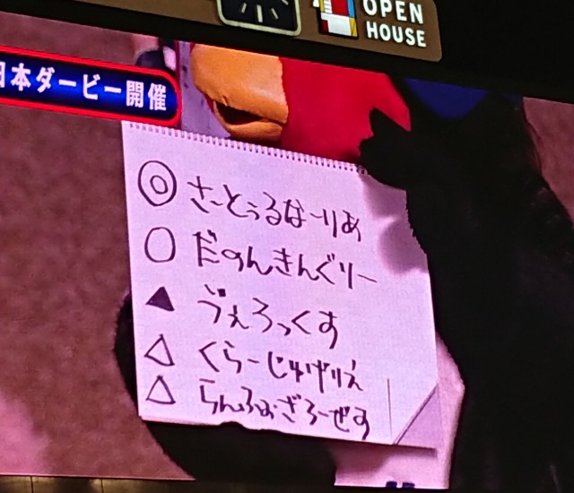 今日ヤクルトスワローズVS中日ドラゴンズを観に行ったのですが、つば九郎が日本ダービーを予想していました。