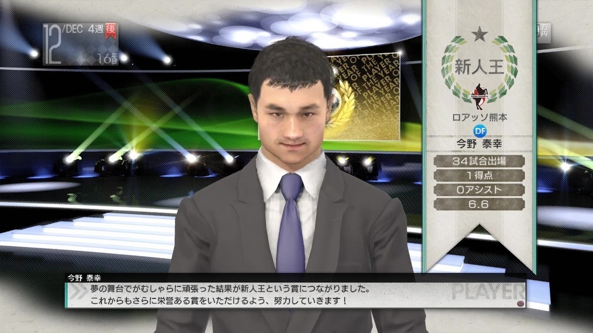新人王は開幕前に期限付き移籍から帰国しJ1ではセンターバックで起用していた今野が獲得。